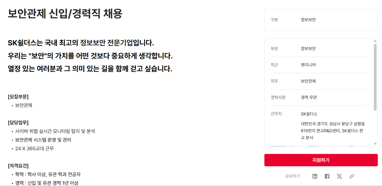 | SK쉴더스 CERT | 24시간 위협 모니터링, 취약점 진단 | 링크 / ![]() |