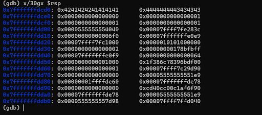 GDB 메모리 덤프(x/40gx $rsp)를 통해 입력 시작점과 목표 변수 사이의 거리를 계산했습니다.